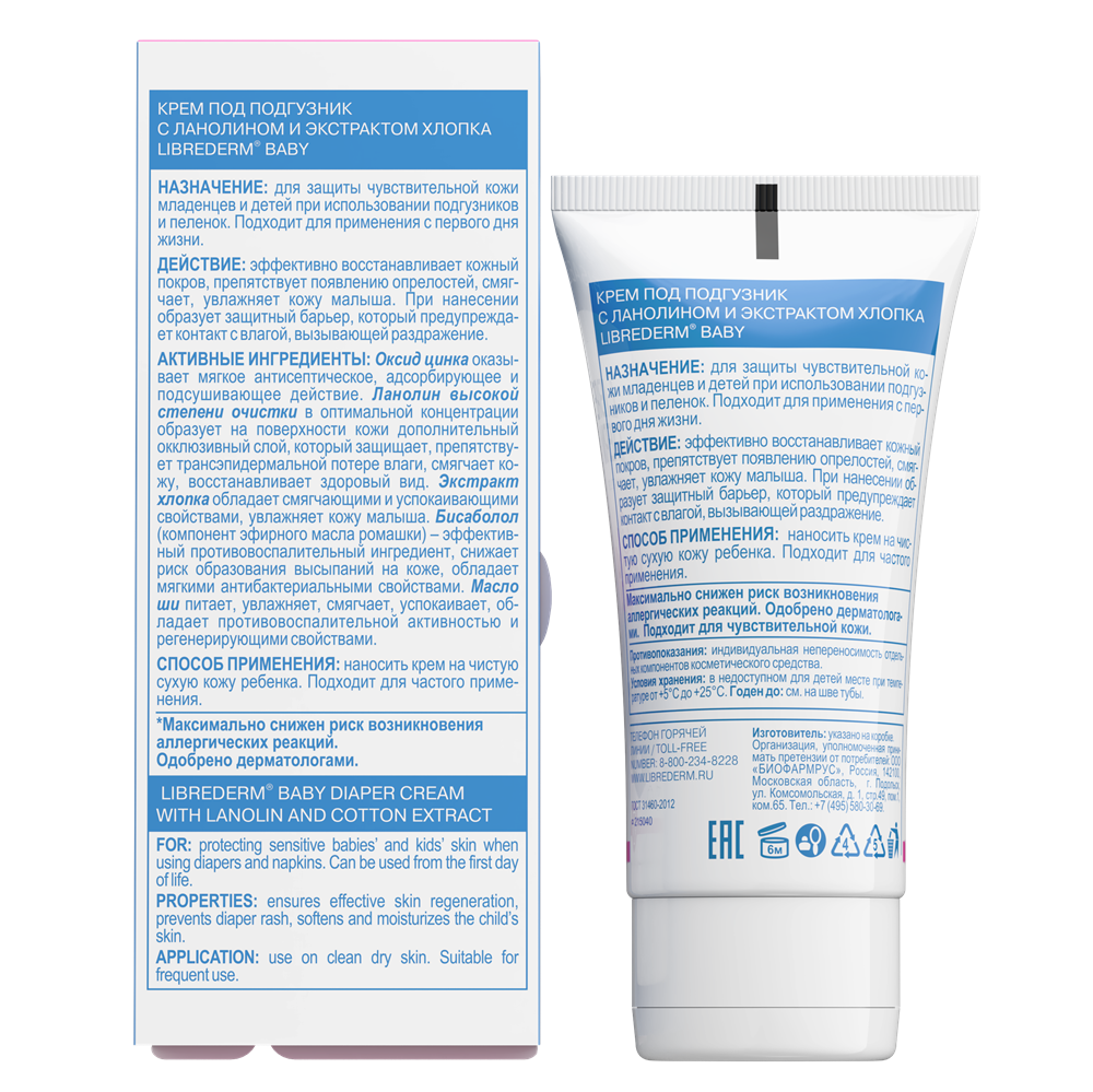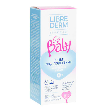 ЛИБРИДЕРМ BABY КРЕМ ПОД ПОДГУЗНИК С ЛАНОЛИНОМ И ЭКСТРАКТОМ ХЛОПКА - предназначен для ухода и профилактики возникновения раздражений и опрелостей при использовании подгузников и пеленок.