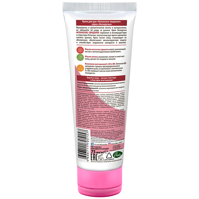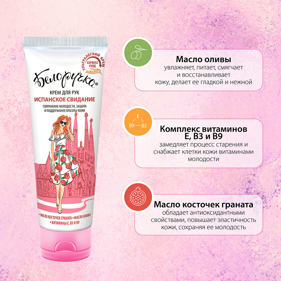 БЕЛОРУЧКА КРЕМ ДЛЯ РУК ИСПАНСКОЕ СВИДАНИЕ - лёгкая тающая текстура, аромат спелого граната
