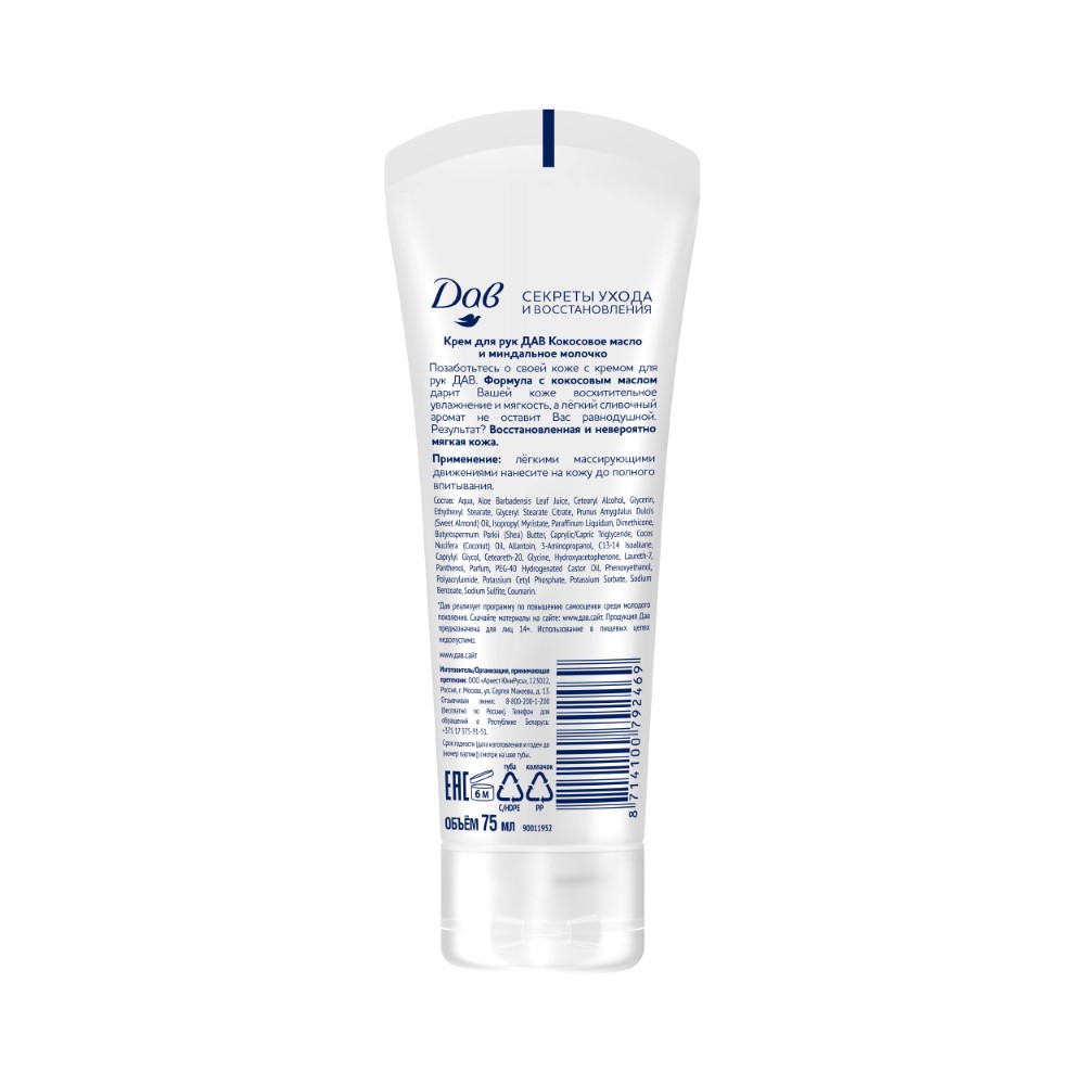 ДАВ КРЕМ ДЛЯ РУК КОКОСОВОЕ МАСЛО И МИНДАЛЬНОЕ МОЛОЧКО.