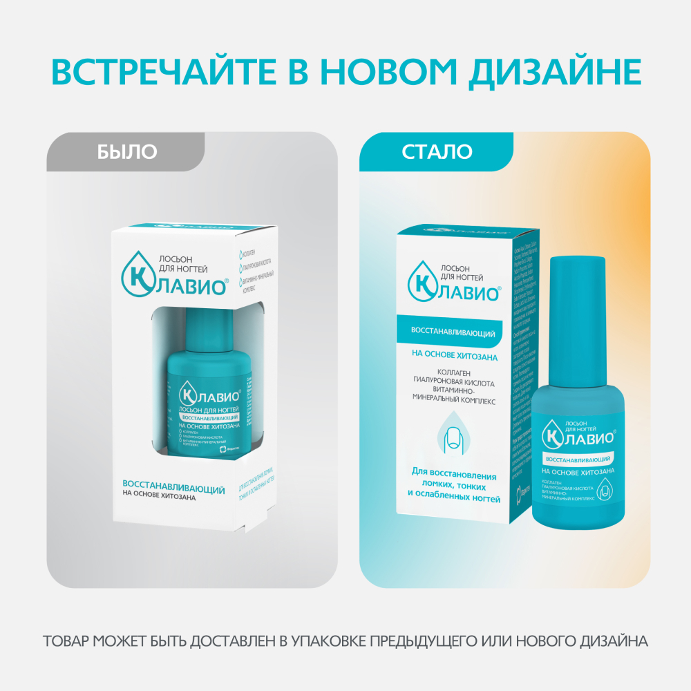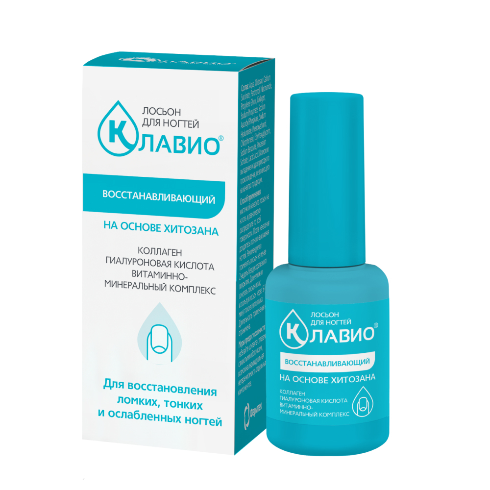 Основой лосьона КЛАВИО является хитозан – биологический полимер, способствующий выравниванию структуры ногтевой пластины и защищающий ее от проникновения внешних агрессивных веществ и потери влаги.