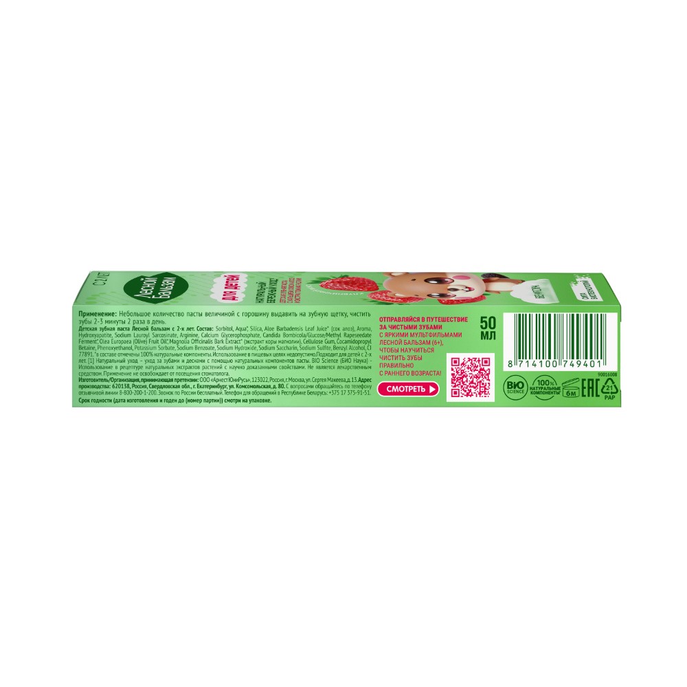Лесной бальзам поддерживает иммунитет и усиливает эффективность естественных защитных функций полости Зубная паста детская с 2 лет Лесной Бальзам с кальцием, соком алоэ и экстрактом магнолии предназначена для деликатного ухода за полостью рта у малышей. И подходит для мальчиков и девочек.