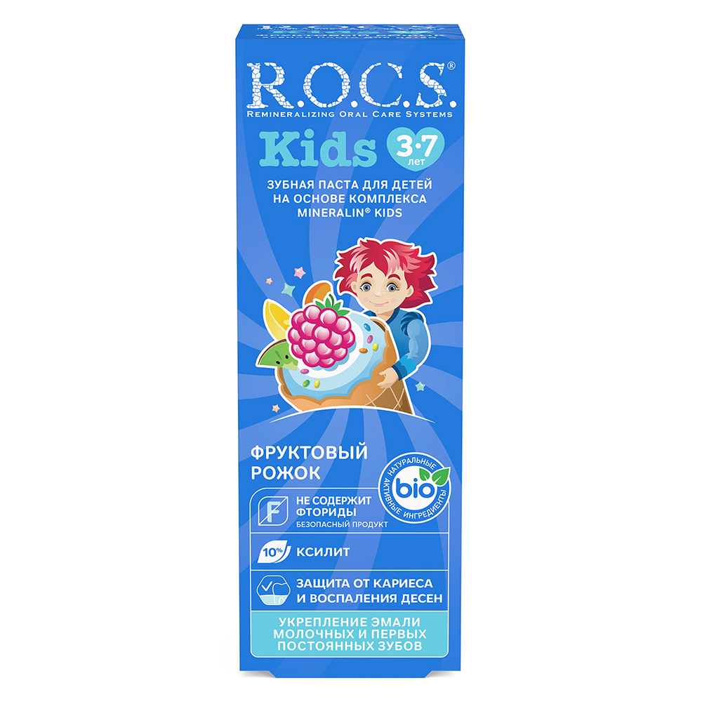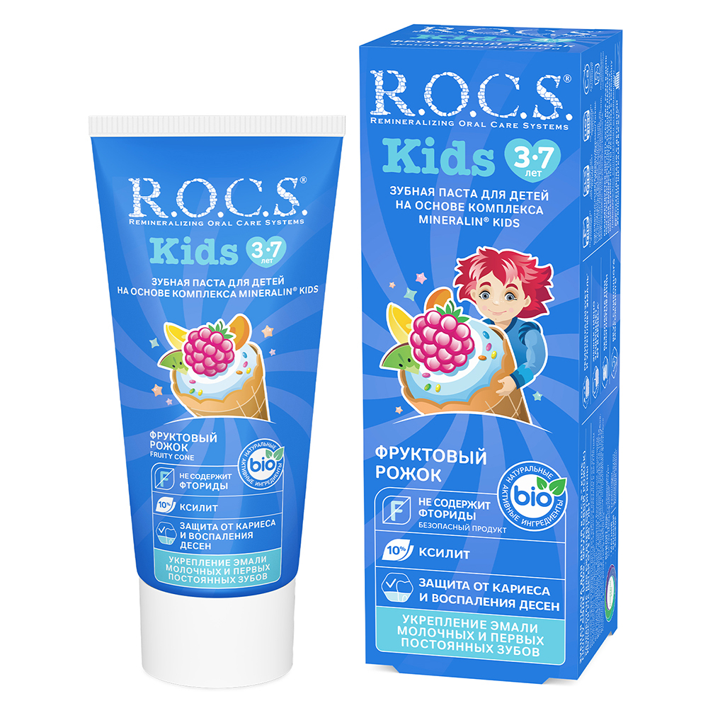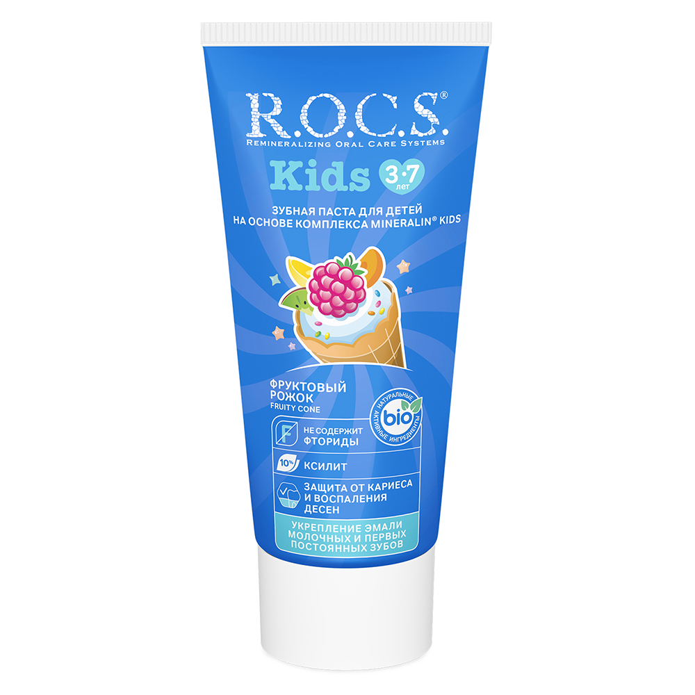 R.O.C.S kids Фруктовый рожок является эффективным средством защиты от кариеса, не содержащим фтор. Противокариозная и противовоспалительная защита* обеспечивается двумя активными компонентами комплекса MINERALIN Kids®: высокими концентрациями ксилита (12%), который подавляет кариесогенные бактерии, и биодоступными минералами - глицерофосфатом кальция и хлорида магния - источниками кальция, фосфора и магния. Обладает свойствами пребиотика - нормализует микробный состав полости рта*, что особенно важно при дисбактериозах полости рта.