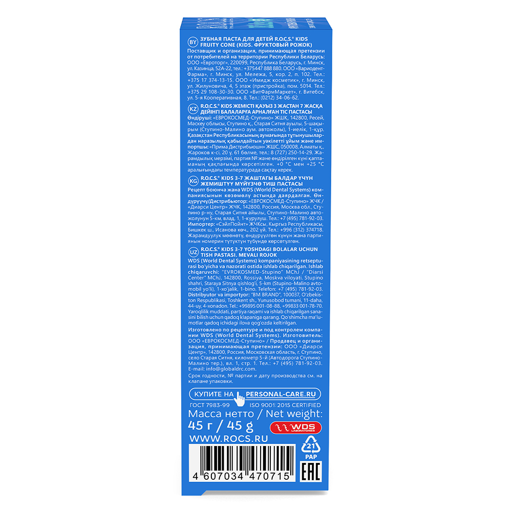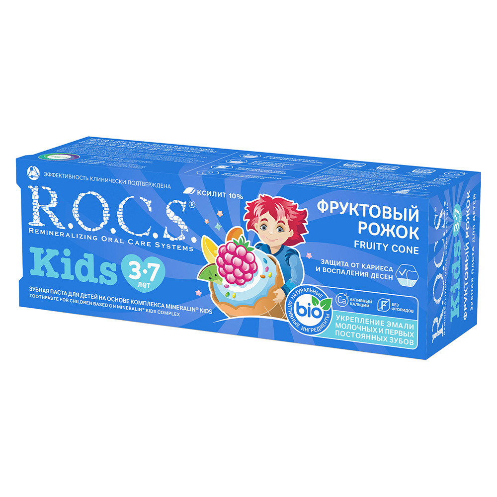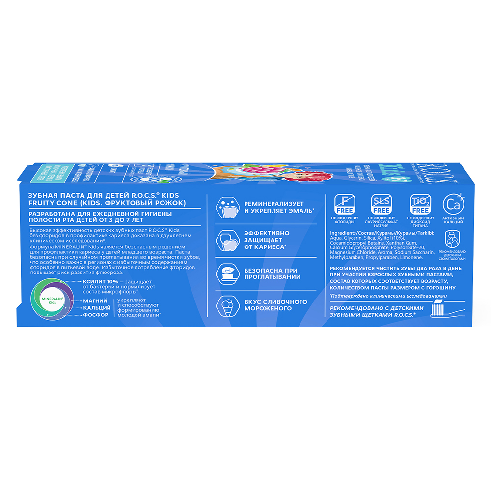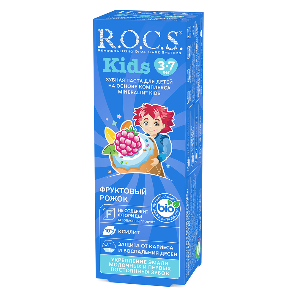 R.O.C.S kids Фруктовый рожок является эффективным средством защиты от кариеса, не содержащим фтор. Противокариозная и противовоспалительная защита* обеспечивается двумя активными компонентами комплекса MINERALIN Kids®: высокими концентрациями ксилита (12%), который подавляет кариесогенные бактерии, и биодоступными минералами - глицерофосфатом кальция и хлорида магния - источниками кальция, фосфора и магния. Обладает свойствами пребиотика - нормализует микробный состав полости рта*, что особенно важно при дисбактериозах полости рта.