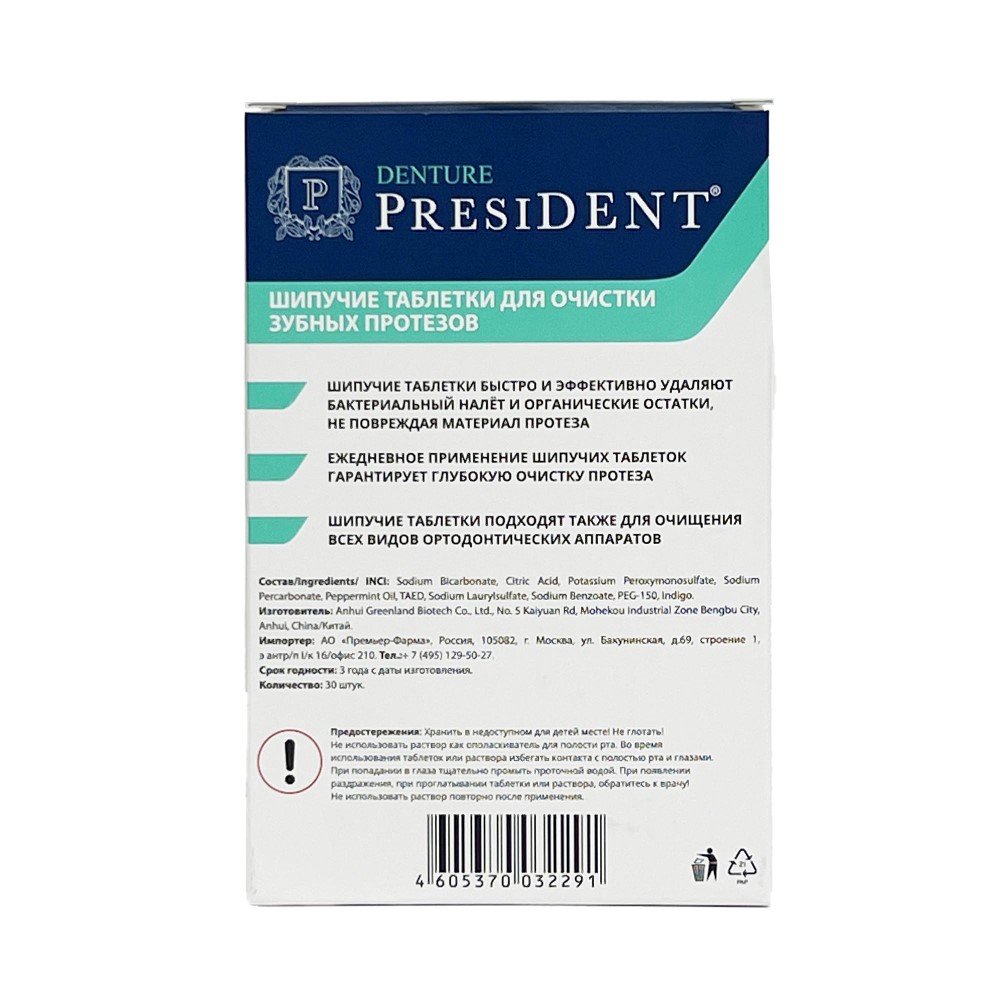 Шипучие таблетки «PRESIDENT DENTURE» предотвращают образование бактериального налёта на протезе.