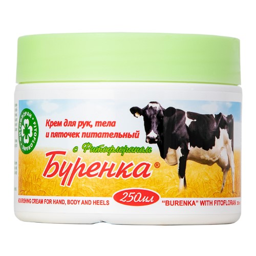 Крем Бурёнка насыщает кожу витаминами, питает, повышает эластичность, выравнивает поверхность кожного покрова.
