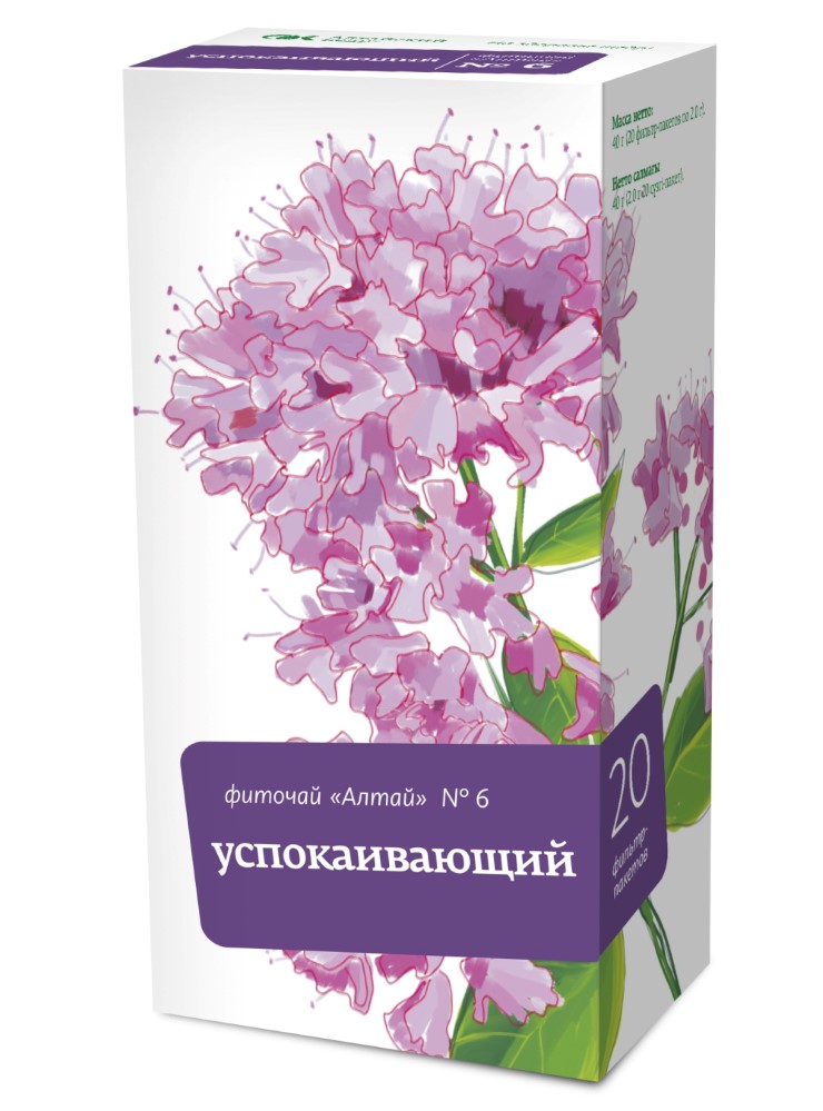 Фиточай «Алтай» №6 Успокаивающий оказывает мягкое успокаивающее и общеукрепляющее действие, способствует улучшению сна, благотворно влияет на сердечно - сосудистую и нервную системы.