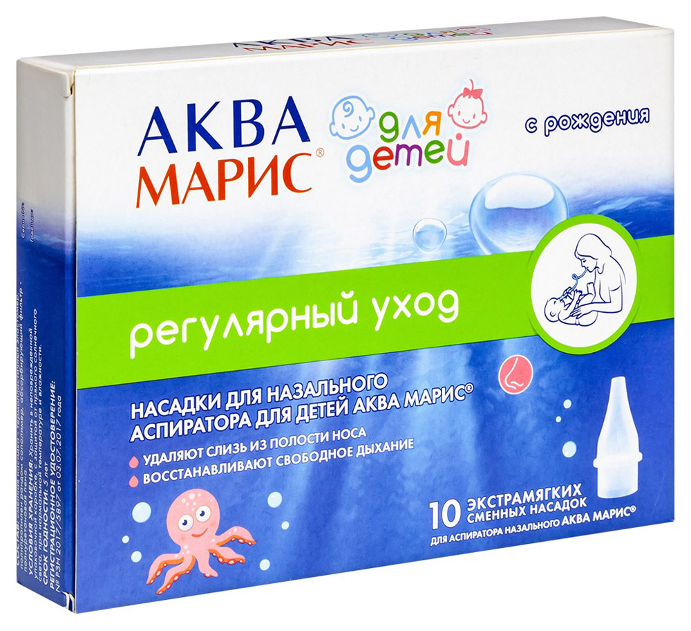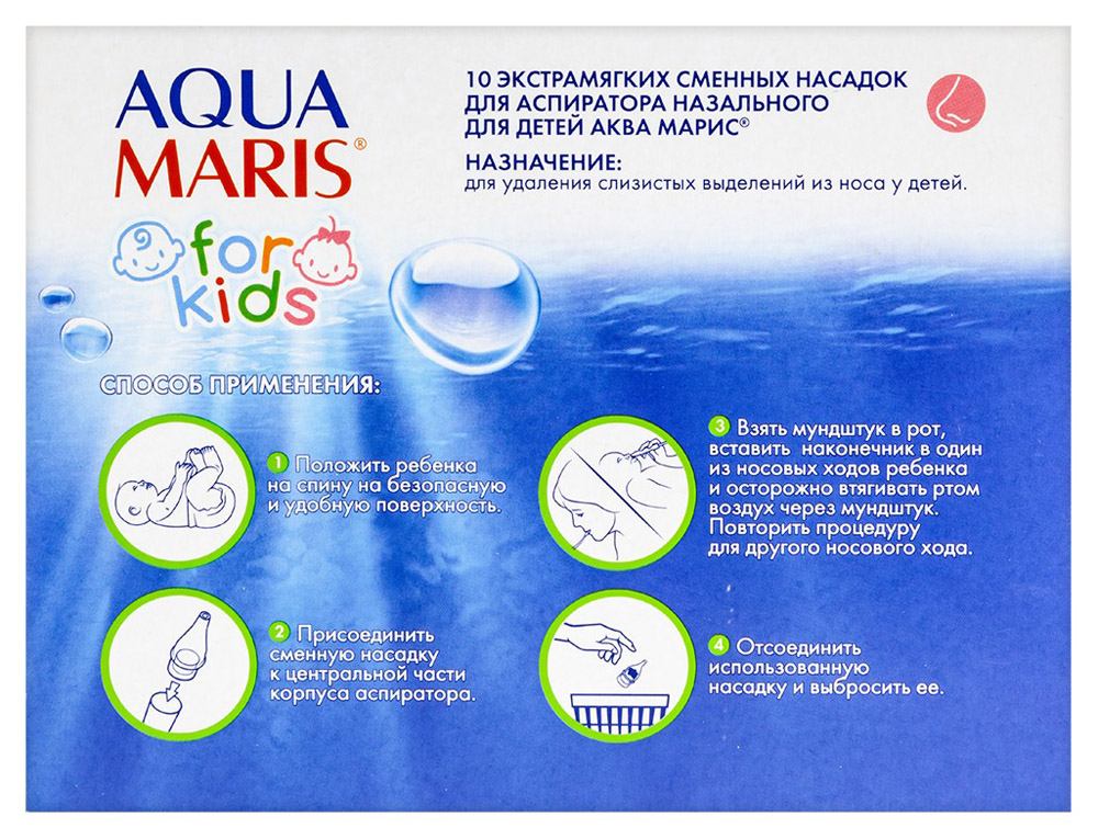 Насадки сменные, соответствующие анатомическим особенностям строения носика ребенка, используются с Аспиратором назальным для детей «АКВА МАРИС®», предназначены для удаления слизистых выделений из носа у детей.