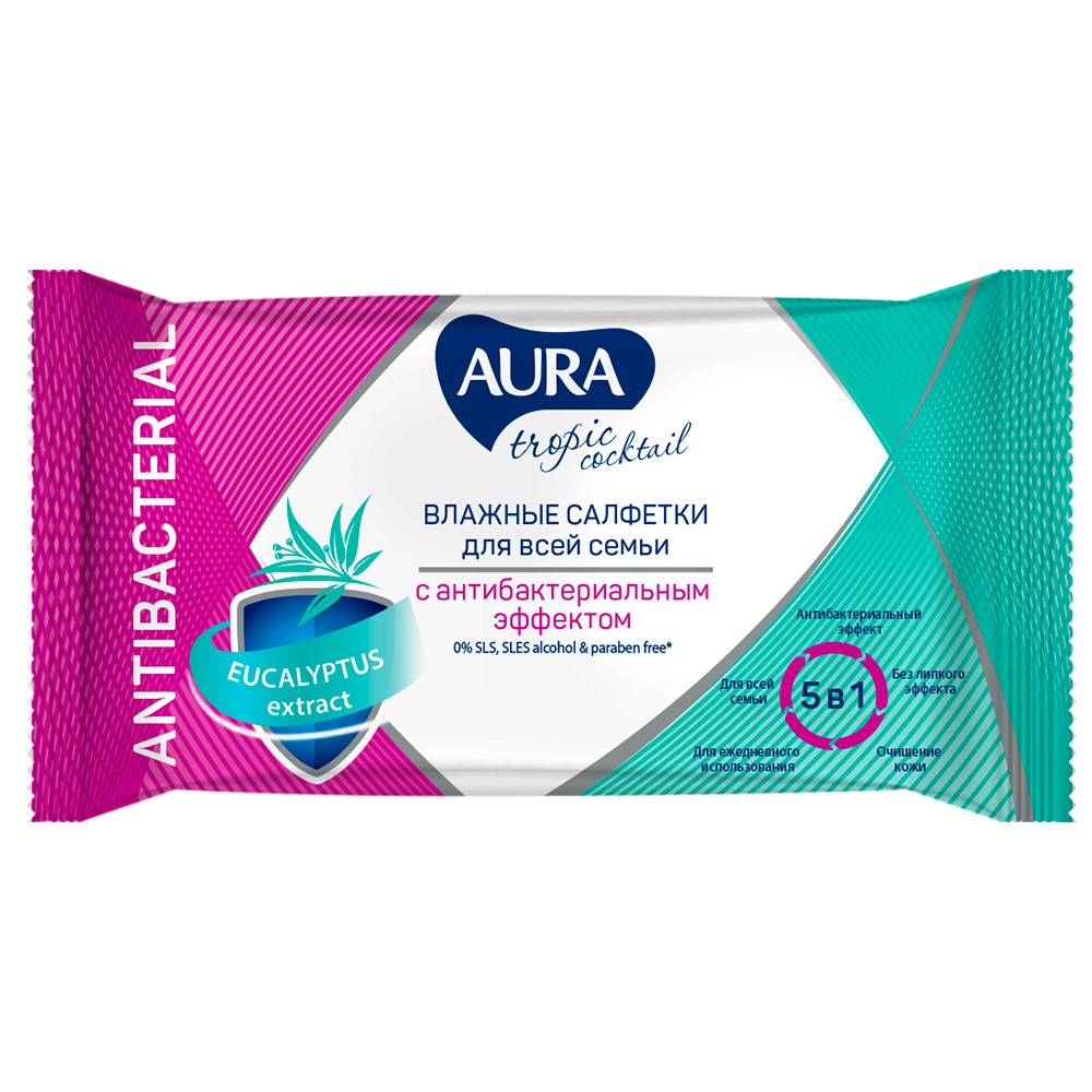 AURA САЛФЕТКИ ВЛАЖНЫЕ С АНТИБАКТЕРИАЛЬНЫМ ЭФФЕКТОМ TROPIC COCKTAIL - влажные освежающие салфетки подходят для всех членов семьи и детей старше 3 лет.