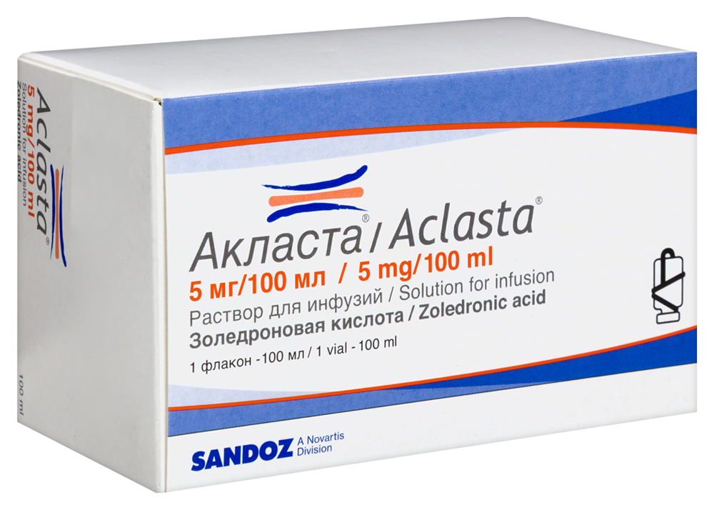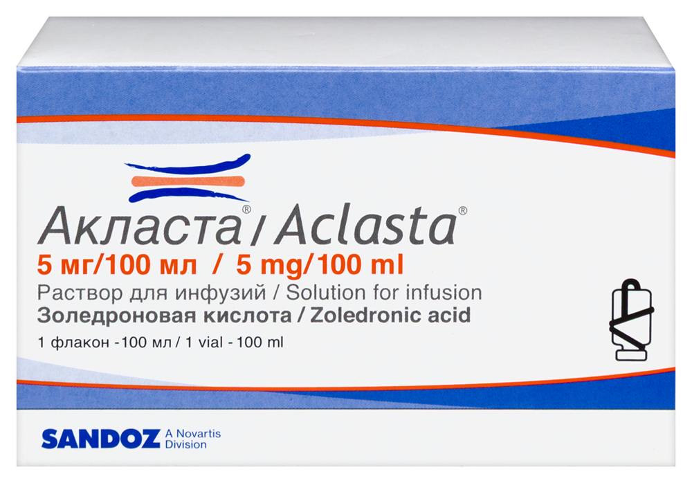 - Способ применения и дозыПрепарат Акласта®, раствор для инфузий, вводят внутривенно инфузионно. Введение препарата следует проводить с помощью клапанной инфузионной системы, обеспечивающей постоянную скорость инфузии, в течение не менее 15 мин. Перед введением препарата Акласта® следует обеспечить адекватную гидратацию пациента. Это особенно важно для пациентов пожилого возраста (≥65 лет), а также для пациентов, получающих терапию диуретическими средствами. Для лечения постменопаузального остеопороза у женщин и остеопороза у мужчин рекомендуемая доза препарата Акласта® составляет 5 мг (содержимое одного флакона препарата - 100 мл раствора) внутривенно 1 раз в год. При недостаточном потреблении кальция и витамина D с пищей следует дополнительно применять препараты кальция и витамина D. Для профилактики последующих переломов у пациентов с переломами проксимального отдела бедренной кости рекомендуемая доза препарата Акласта составляет 5 мг (содержимое одного флакона препарата - 100 мл раствора) внутривенно 1 раз в год. Пациентам с недавним (до 90 дней) переломом проксимального отдела бедренной кости рекомендуется за 2 недели до первой инфузии препарата Акласта® принять однократно витамин D в высокой дозе (от 50 000 до 125 000 ME перорально или внутримышечно). При однократном применении препарата Акласта® пациентам рекомендовано в течение 14 дней до инфузии ежедневно принимать внутрь препараты кальция (1000 мг в сутки и витамина D (800 ME в сутки). После инфузии препарата Акласта® в течение года пациентам также следует принимать препараты кальция и витамина D. Для профилактики последующих переломов у пациентов с переломами проксимального отдела бедренной кости первую инфузию препарата следует проводить через 2 и более недель после операции. Для лечения остеопороза, вызванного применением глюкокортикостероидов, рекомендуемая доза препарата Акласта® составляет 5 мг (содержимое одного флакона препарата - 100 мл раствора) внутривенно 1 раз в год. При недостаточном потреблении кальция и витамина D с пищей у пациентов с остеопорозом следует дополнительно применять препараты кальция и витамина D. Для профилактики постменопаузального остеопороза рекомендуемая доза препарата Акласта® составляет 5 мг (содержимое одного флакона препарата - 100 мл раствора) внутривенно 1 раз в 2 года. Для принятия решения о необходимости проведения повторной инфузии следует ежегодно проводить повторную оценку риска возникновения переломов и оценку клинического ответа на терапию. Для профилактики постменопаузального остеопороза очень важно достаточное поступление в организм кальция и витамина D. В случае их недостаточного потребления с пищей, рекомендуется дополнительный прием препаратов кальция и витамина D. Для лечения костной болезни Педжета рекомендуется однократное введение 5 мг препарата Акласта® внутривенно. Костная болезнь Педжета характеризуется высокой активностью обмена костной ткани. Вследствие быстрого наступления эффекта в отношении костного обмена, после применения препарата Акласта®, в течение первых 10 дней после инфузии, может развиваться преходящая гипокальциемия. На фоне применения препарата Акласта® следует обеспечить достаточное потребление витамина D.. В добавление к этому, строго рекомендовано принимать адекватную дозу кальци