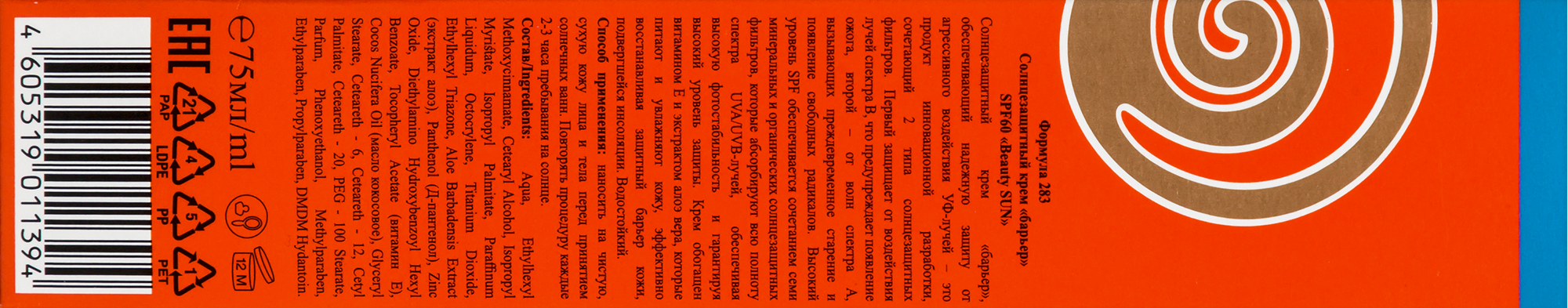 Солнцезащитный крем «барьер», обеспечивающий надежную защиту от агрессивного воздействия УФ-лучей - это продукт инновационной разработки, сочетающий 2 типа солнцезащитных фильтров. Первый защищает от воздействия лучей спектра В, что предупреждает появление ожога, второй - от волн спектра А, вызывающих преждевременное старение и появление свободных радикалов. Высокий уровень SPF обеспечивается сочетанием семи минеральных и органических солнцезащитных фильтров, которые абсорбируют всю полноту спектра UVA/UVB-лучей, обеспечивая высокую фотостабильность и гарантируя высокий уровень защиты. Крем обогащен витамином Е и экстрактом алоэ вера, которые питают и увлажняют кожу, эффективно восстанавливая защитный барьер кожи, подвергшейся инсоляции. Водостойкий.