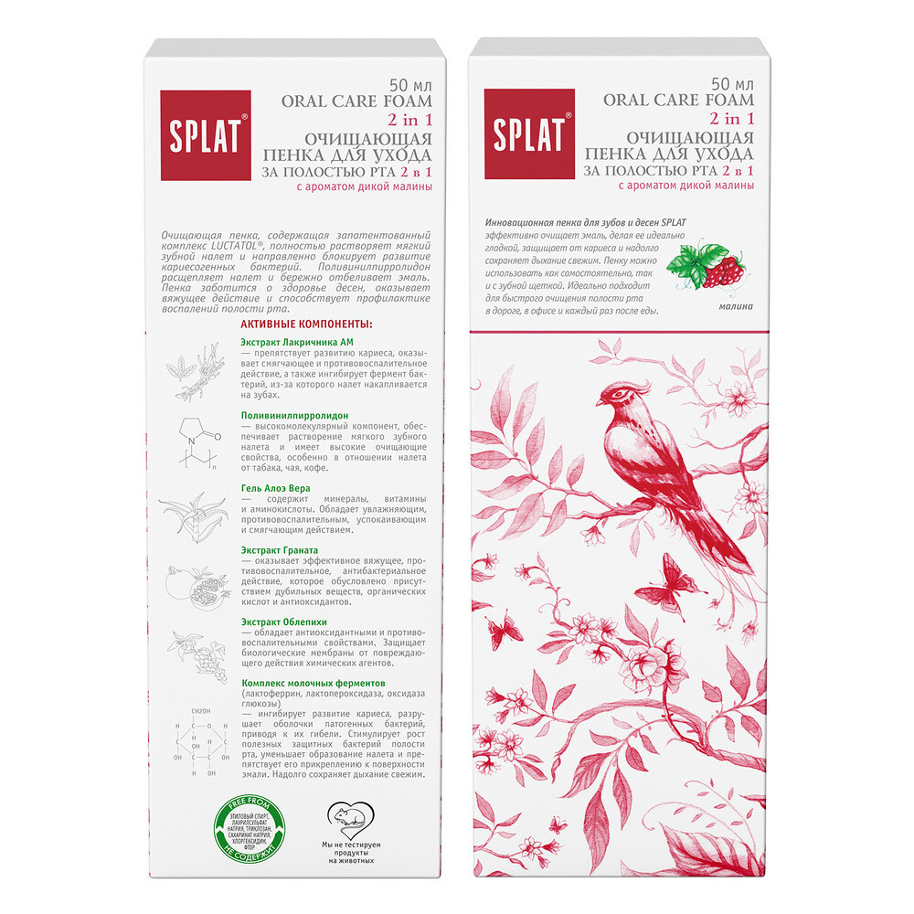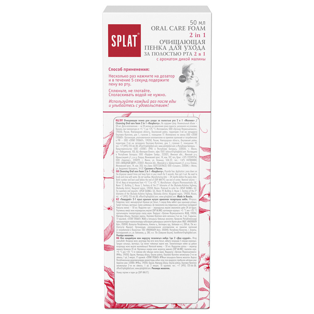 Очищающая пенка-паста для зубов и десен SPLAT с ароматом дикой малины рекомендована стоматологами в качестве дополнительного ухода за полостью рта. Воздушная малиновая пена за 5 секунд расщепляет налет, защищает от кариеса и надолго освежает дыхание!